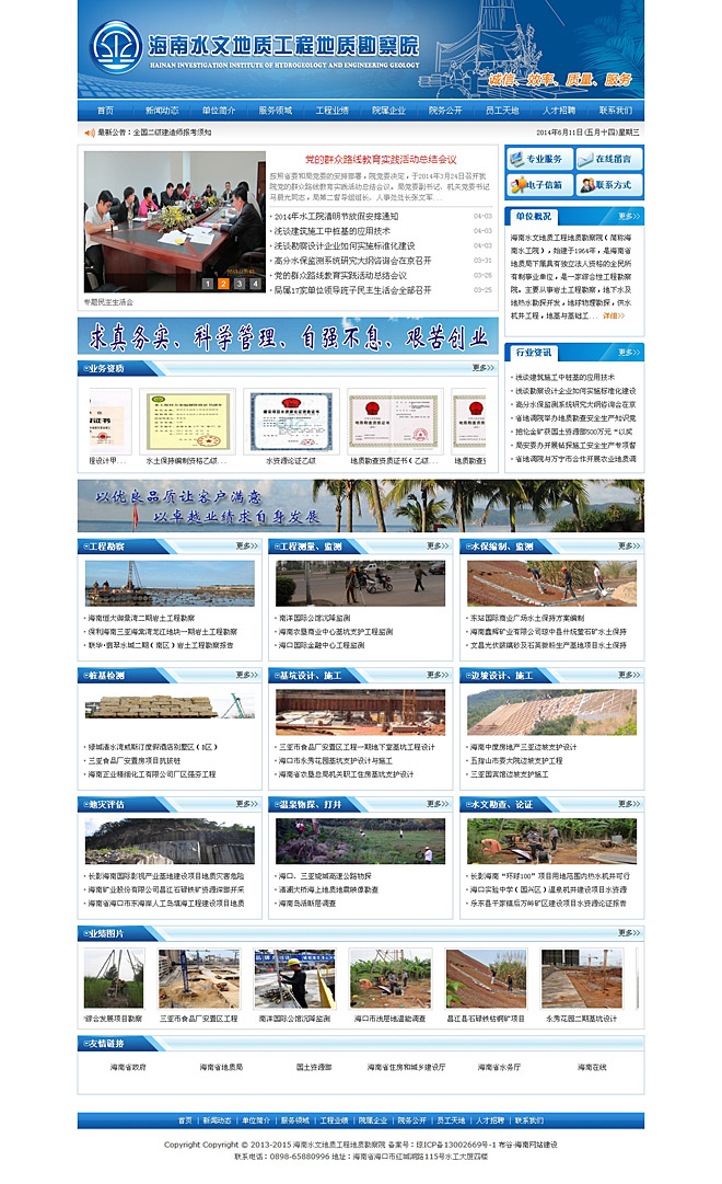 海南水文地質(zhì)工程地質(zhì)勘察院(簡稱海南水工院),始建于1964年, 是海南省地質(zhì)局下屬具有獨立法人資格的全民所有制事業(yè)單位,是一家綜合性工程勘察院。主要從事巖土工程勘察,地下水及地?zé)崴碧介_發(fā),地球物理勘探,供水機(jī)井工程,地基與基礎(chǔ)工程,市政工程,邊坡錨固工程,水利與環(huán)保工程的施工,地形測量,樁基檢測,巖土工程測試,地質(zhì)災(zāi)害危險性評估及勘查、設(shè)計、施工,水土保持方案編制與監(jiān)測等工作。持有建設(shè)部頒發(fā)的工程勘察綜合類甲級資質(zhì)證書;國土資源部頒發(fā)的地質(zhì)災(zāi)害治理工程勘查、設(shè)計、施工甲級證書及地質(zhì)災(zāi)害危險性評估甲級證書,水工環(huán)地質(zhì)勘查甲級,液體礦產(chǎn)勘查甲級,固體礦產(chǎn)勘查,地質(zhì)鉆探乙級資質(zhì)證書;水利部頒發(fā)的水土保持方案編制乙級及水土保持監(jiān)測乙級;海南省水務(wù)局頒發(fā)的建設(shè)項目水資源論證乙級資質(zhì)證書等。2006年獲得ISI9001:2000質(zhì)量管理體系認(rèn)證。