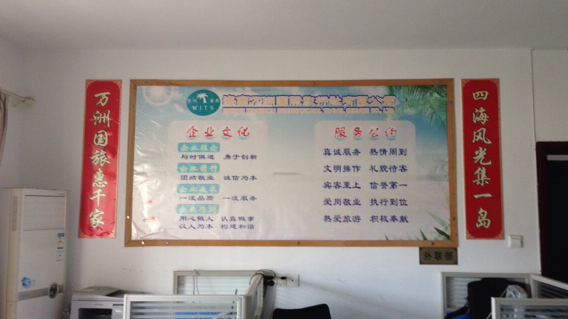 海南省萬洲國際旅行社有限公司是經(jīng)海南省工商局登記注冊,由海南省旅游局審批,并足額繳納質(zhì)量保證金后,于2010年成立。公司管理、業(yè)務(wù)、技術(shù)等骨干人員,多為海南建省后在海南旅游建設(shè)大潮中踏浪而歌的佼佼者,它們久經(jīng)旅游事業(yè)規(guī)則的不斷洗禮,緊跟著海南旅游共同成長,是營銷、酒店、房產(chǎn)、交通、網(wǎng)絡(luò)、餐飲等各個行業(yè)中不可多得的人才。因此,萬洲國旅在酒店、景區(qū)、車輛、導(dǎo)游、餐廳等環(huán)節(jié)上早已有了劣實的基礎(chǔ)。憑著多年的經(jīng)驗 、專業(yè)的知識、廣泛的資源、堅定的信念、遠大的抱負、永恒的激情、誠摯的信用、不斷創(chuàng)新的精神和忘我的工作熱情,萬洲國旅將為海南國際旅游島增添更多的光彩。